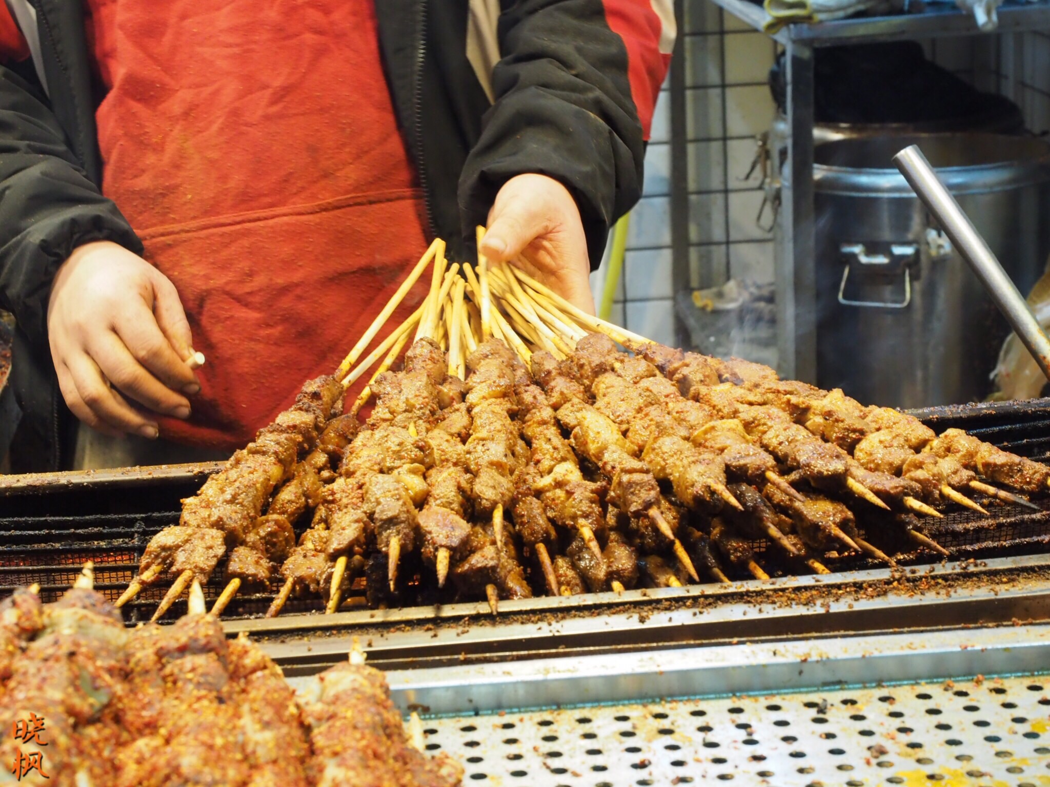 老板在娴熟的烤制着肉串