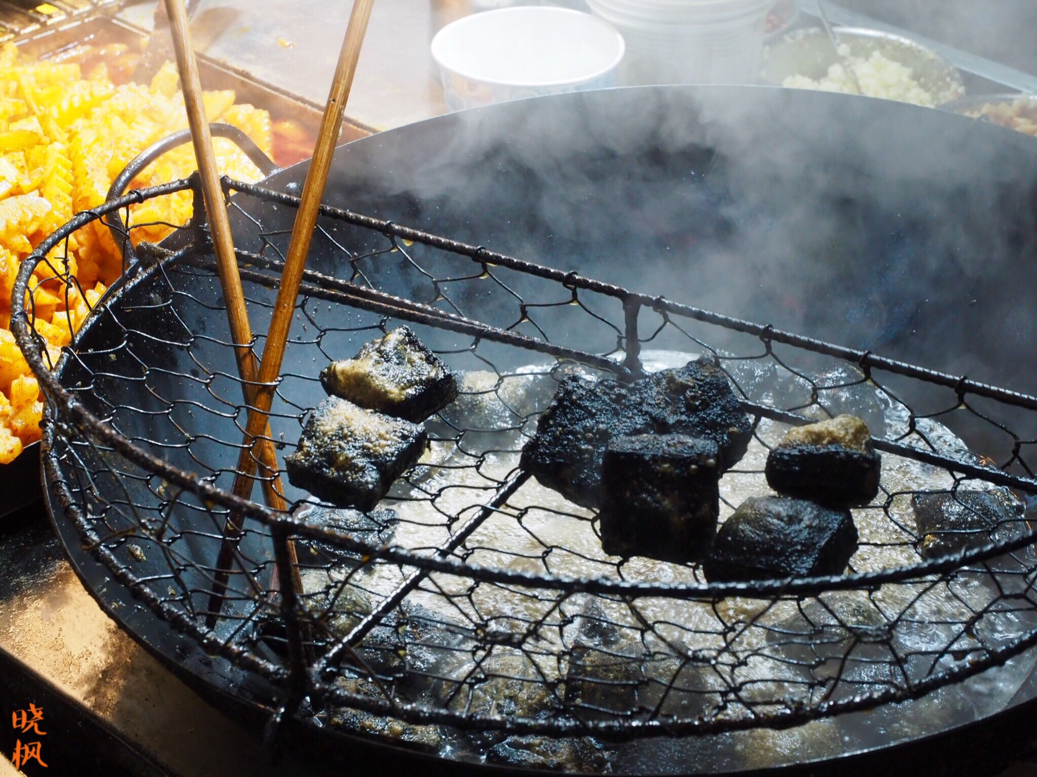 黑色的臭豆腐在油锅中炸熟,浇上湖南剁椒酱调制的酱汁,滋味浓郁,闻着臭但是吃着很香