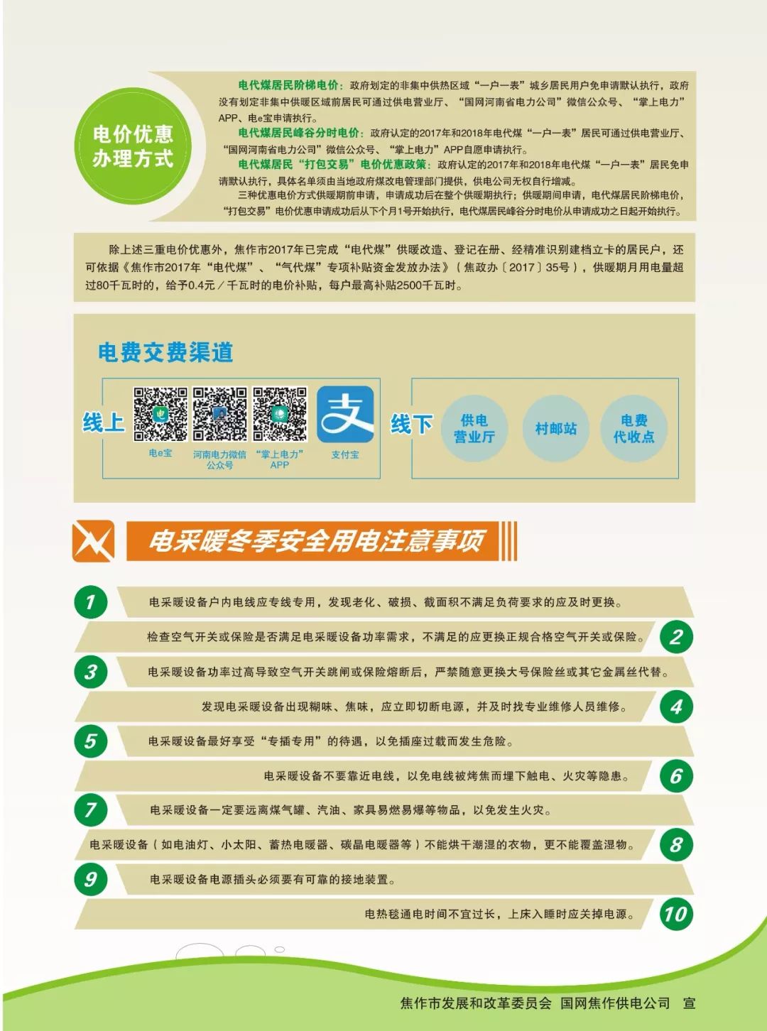 据了解,以上的三项电价优惠政策可叠加享受。同时,针对我市2017年完成的“电代煤”供暖改造、登记在册、经精准识别建档立卡的居民户,依据《焦作市“电代煤”“气代煤”专项补贴资金发放办法》,采暖季每月用电量超过80千瓦时的,各县市区政府给予0.4元/千瓦时的电价补贴,每户最高补贴2500千瓦时。另外,对非集中供暖区域管道天然气“一户一表”壁挂炉取暖用户,采暖季一档气量在原来50立方米的基础上每户每月增加100立方米。