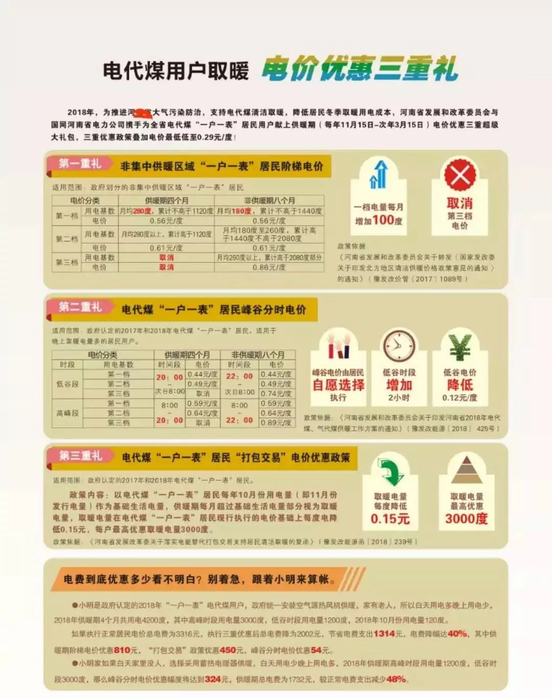 为了推进“双替代”供暖工作的进展,我市健全完善了价格支持政策。在“电代煤”供暖用户的电价优惠上,采暖季对非集中供暖区域“一户一表”居民实行阶梯电价优惠,一档电量每月增加100千瓦时,取消第三档电价;参加“电代煤”供暖改造的“一户一表”居民可自愿选择供暖季“电代煤”峰谷分时电价,采暖季低谷时段增加2小时,调整为20时至次日8时,低谷电价降低0.12元/千瓦时,即供暖期低谷时段电价为每日20时至次日8时在分档电价的基础上每千瓦时降低0.12元,供暖期峰谷时段电价为每日8时至20时在分档电价的基础上每千瓦时提高0.03元,此项优惠可向供电部门申请;“电代煤”“一户一表”居民“打包交易”电价优惠政策,是以“电代煤”“一户一表”居民每年10月份用电量(即11月份发行电量)作为基础生活电量,供暖期每月超过基础生活电量部分视为取暖电量,取暖电量在“电代煤”“一户一表”居民现行执行的电价基础上每千瓦时降0.15元,每户最高优惠取暖电量3000千瓦时。