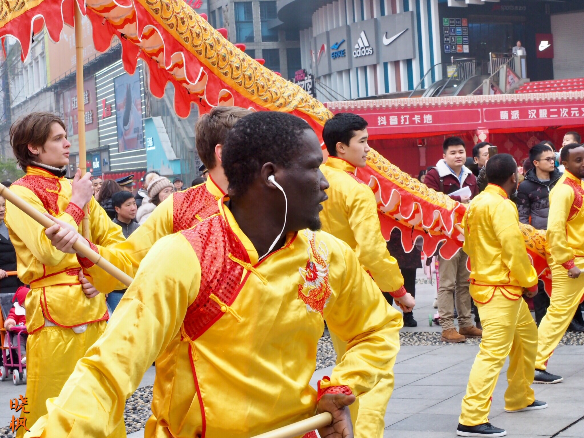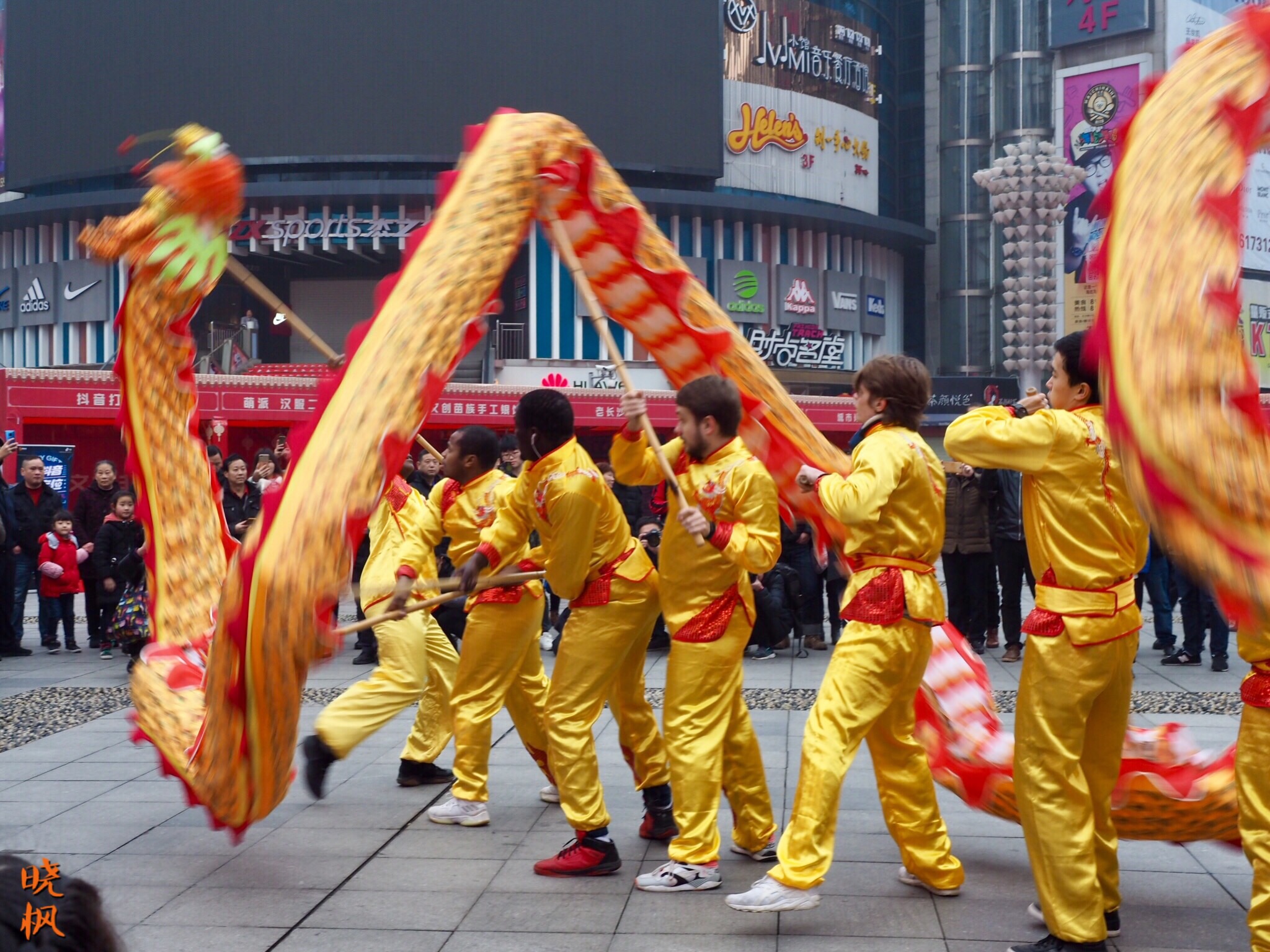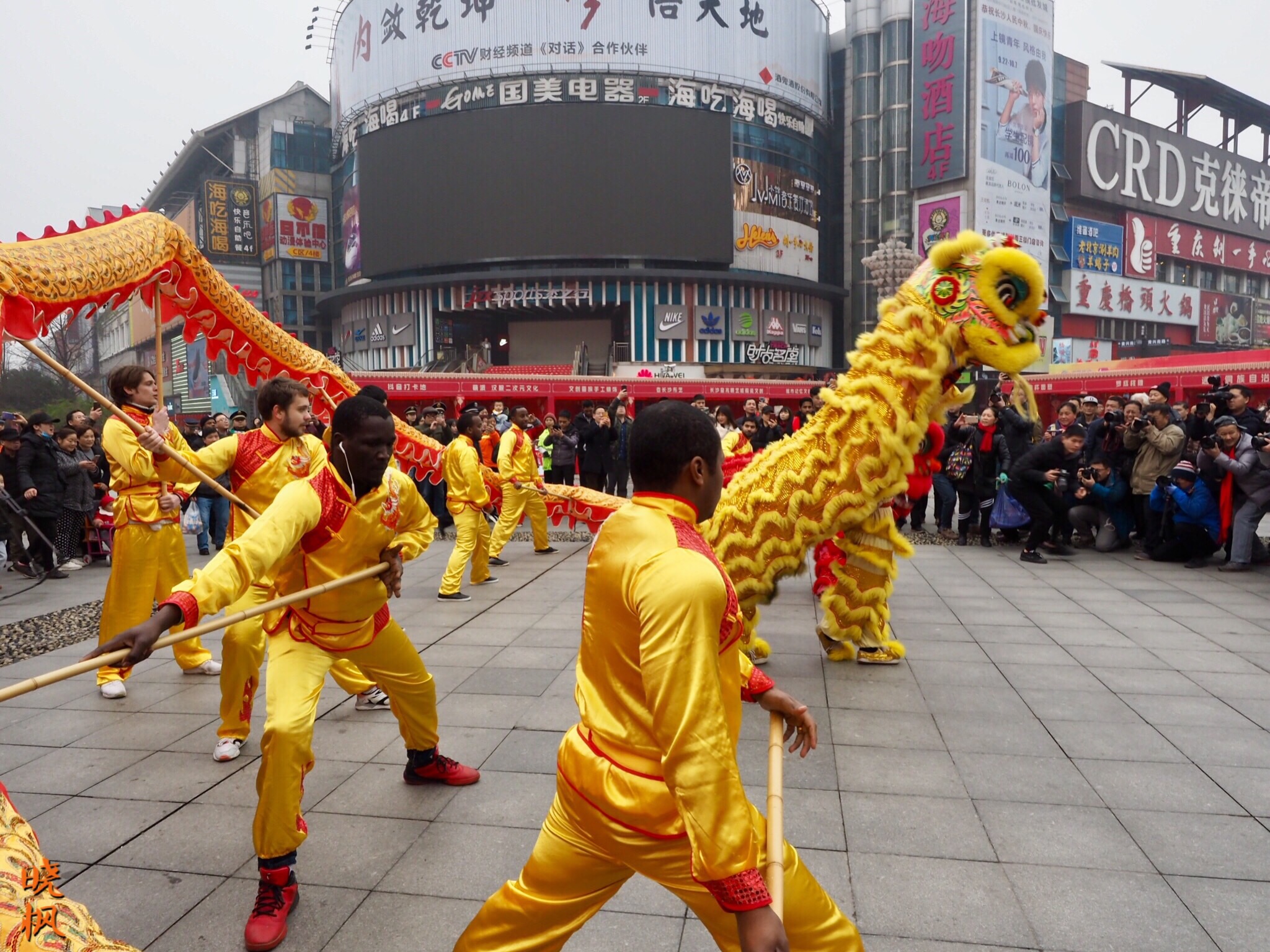 外国友人参与了中国的传统春节庆祝方式----舞龙(照片拍摄于湖南长沙黄兴广场,火宫殿庙会开幕仪式)