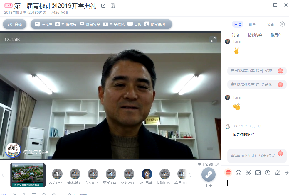 3月6日晚20:00,青椒计划2019新学期开学典礼迎来了新时代的乡村教育家一一南京浦口区行知教育集团总校长、全国十佳师德标兵杨瑞清校长,全国各地8000多位乡村青年教师在线参与。通过互联网面对面聆听杨瑞清校长从1981年中师毕业以来坚持乡村教育,38年走在行知路上的教育感悟,努力做知行合一的新时代乡村教师楷模。
