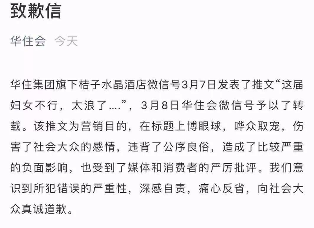 《中国消费者报》记者获悉,3月10日上午,华住集团发表致歉信,对旗下桔子水晶酒店微信号3月7日发表推文“这届妇女不行,太浪了…”致歉,致歉信称,该推文为营销目的,在标题上博眼球,哗众取宠,伤害了社会大众的感情,违背了公序良俗,造成了比较严重的负面影响,也受到了媒体和消费者的严厉批评。同时意识到所犯错误的严重性,深感自责,痛心反省,向社会大众真诚道歉。