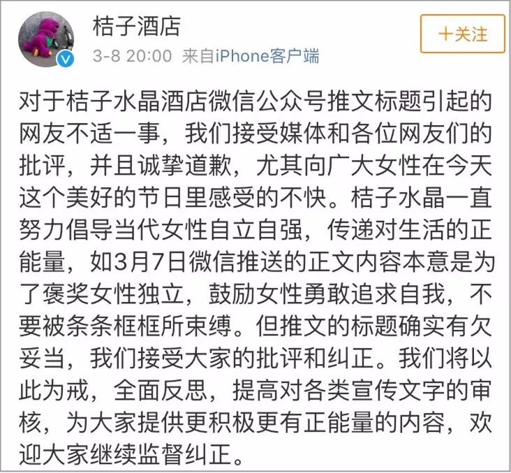 点击查看独家报道:妇女节前夜,桔子水晶酒店竟发了一条侮辱女性的推送......
