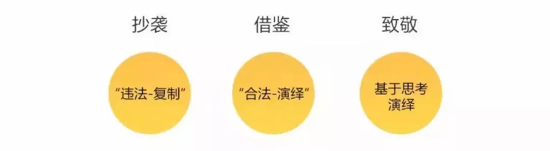 借鉴和致敬都是美好的词语,让人感觉是善意的。而抄袭人人喊打。那么什么是借鉴?什么是致敬?从著作权法来看,“抄袭”可以被拆解为“违法-复制”,“借鉴”可以拆解为“合法-演绎”。“复制”和“演绎”本身均是中性的。而根据《著作权法》第四十六条之规定,不论是否经过著作权人许可,剽窃他人作品的都构成侵权。可以说,抄袭本身就是违法的,也就是说即使你挂上了好听的借鉴的名称,只要是抄袭、剽窃,你仍然可能被告!那么什么是致敬?其实致敬是一种基于思考和演绎,对于前作进行解构或跨领域的重新创作,并且对被致敬者不构成侵害的设计方法。致敬和借鉴的前提都是需要经过思考过程和著作权所有人的认可方视为可行。