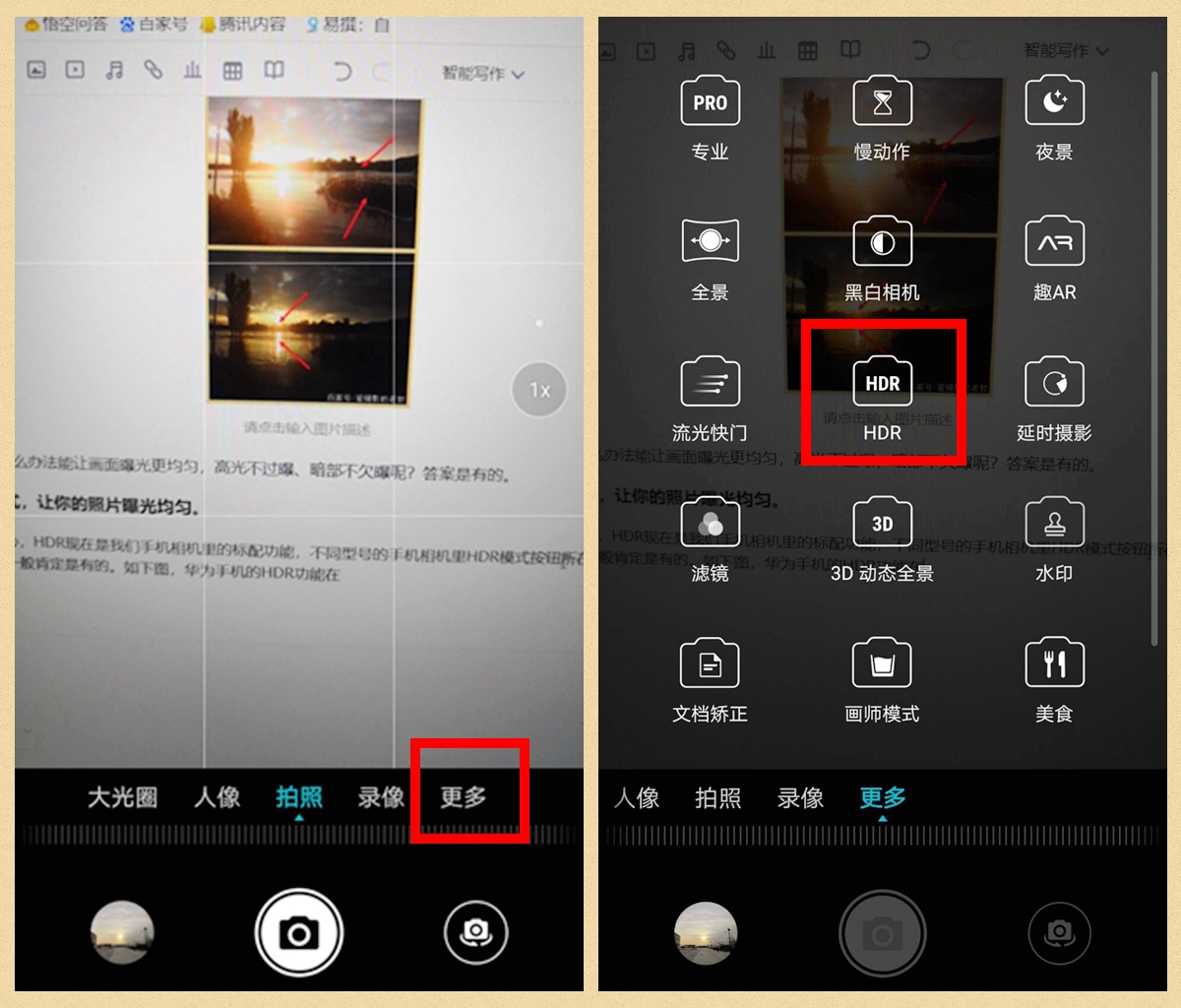 HDR现在是我们手机相机里的标配功能,不同型号的手机相机里HDR模式按钮所在的位置可能有所不同,但一般肯定是有的。如下图,华为手机的HDR功能在拍照菜单的“更多”里面,其他品牌的手机,请大家自己寻找。