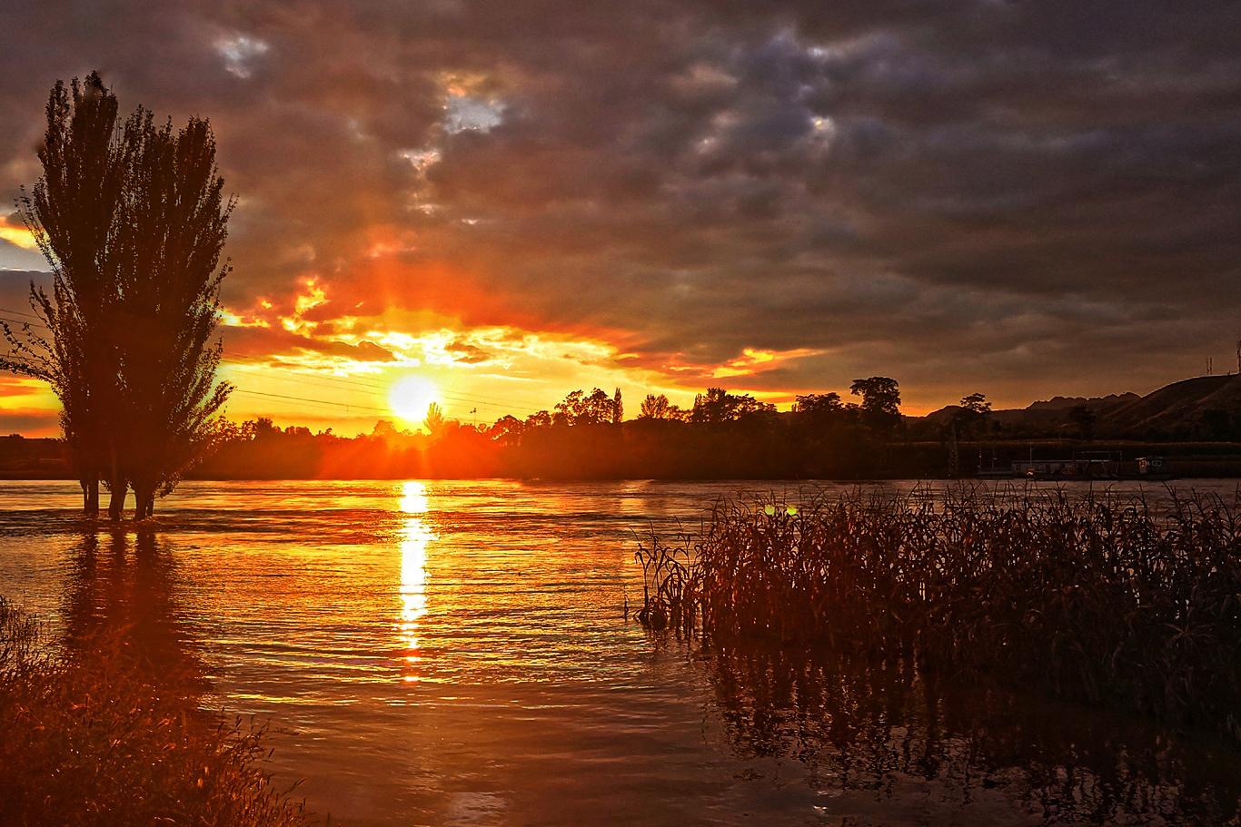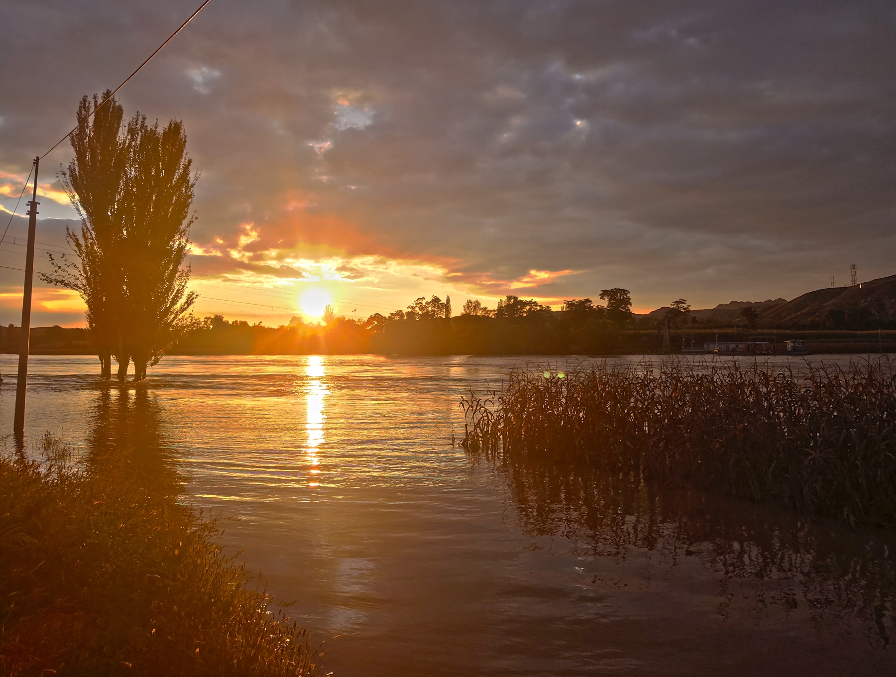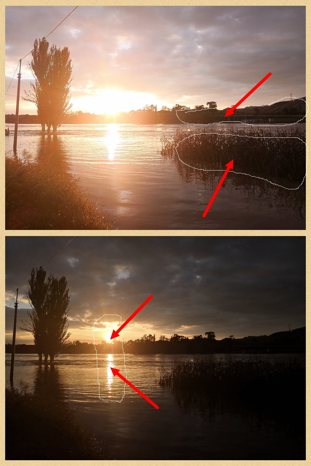测光点位置的不同会导致画面中光影细节有显著的明暗变化,把测光点选到画面中暗部区域,那么手机相机会提高整个画面的亮度,从而保证测光点处得到正确的曝光,这样就会导致画面的高光部分过度曝光,出现大片死白,如下图第一张,对着箭头所指的暗部测光,落日那一片就过曝了。反之把测光点选到画面中高光区域,那么手机相机会拉低整个画面的亮度来保证测光点处曝光正确,从而使画面的暗部曝光不足,如下图第二张,对着太阳处测光,画面右下角水面植物那一片曝光不足,呈现一片死黑。
