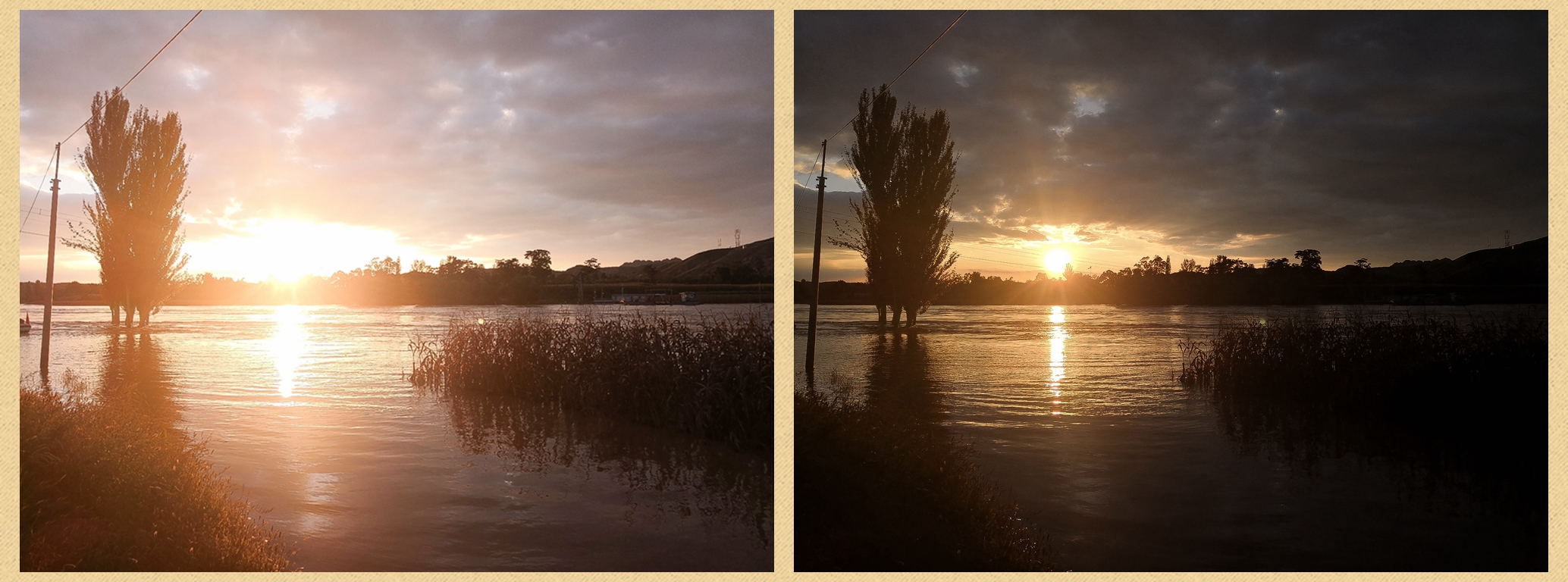 我们用手机拍日出日落的时候,很容易会出现以下这样的情况:要么整个画面偏亮,太阳那里更是一片惨白,如下图左;要么整个画面偏黑,只有太阳那里有一些亮,如下图右。