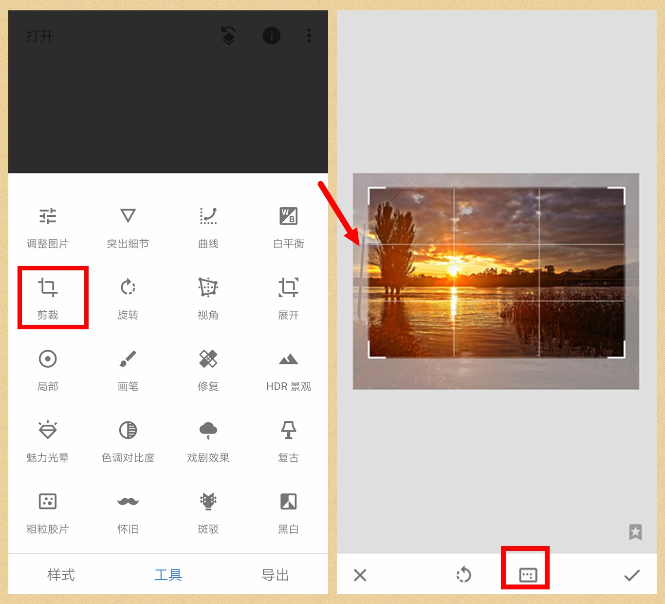 第五步:到这里对于照片的光影调整基本就完成了,但是我们发现画面里还有一些多余元素,使照片显得杂乱,比如画面左面有一个电线杆,左上角有电线。下面我们用snapseed的裁剪和修复功能,来剔除照片里的多余元素。先打开“裁剪”,在页面下方选择构图比例,这里我选择的是2:3,然后拉动边框,使电线杆处在画面之外,使地平线大概位于画面正中靠下的位置,如下图,点右下角对号确定。