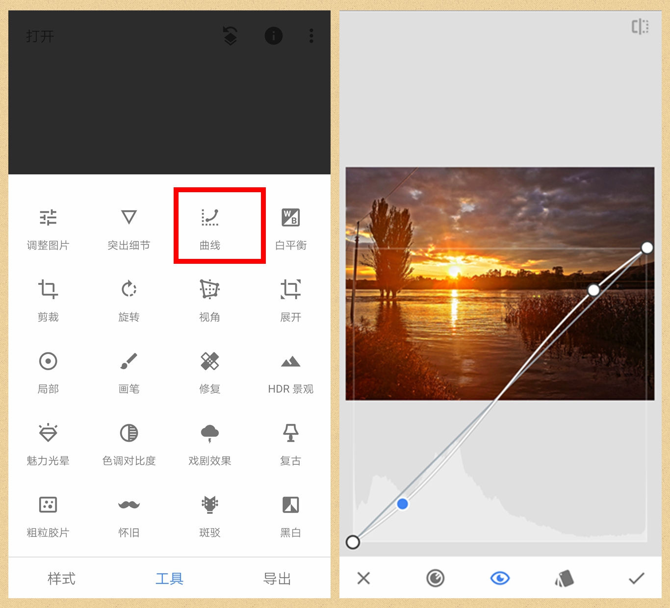 第四步:回到工具页面,打开“曲线”,稍微提高一点亮部压低一点暗部,如下图右,使画面对比更明显、更通透一点。