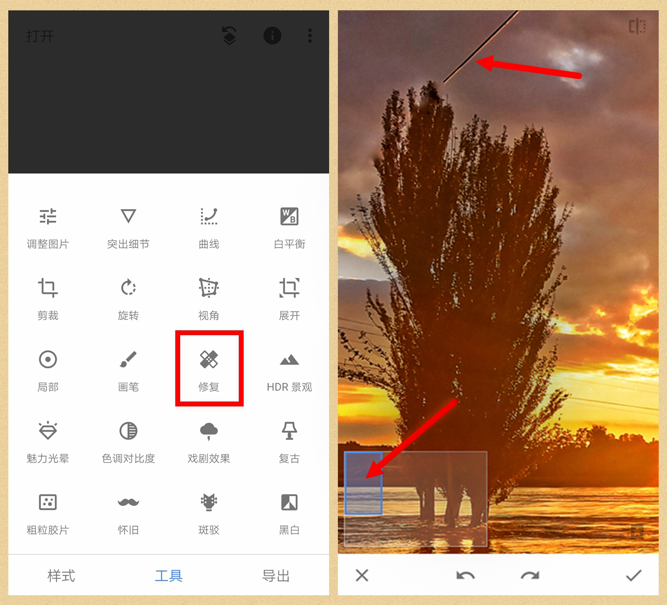第六步:再回到工具菜单打开“修复”,用食指和中指摁住画面再向两边滑开,画面就变大了,同时左下方出现了一个大框和一个蓝色小框,我们点住蓝色小框移动,就会发现放大的画面也随之移动,这样通过移动小蓝框找到大画面上需要修复的电线的位置,再用手指在电线上轻轻一抹,电线就没有了。重复以上步骤,直到电线全部被抹掉,点右下角对号确定。