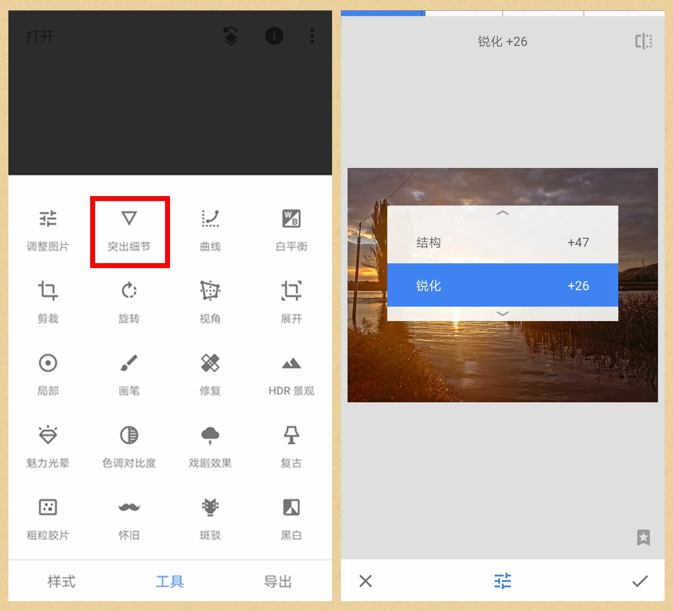 第二步:点开“工具”菜单,选择“突出细节”,在弹出的页面里上下滑动屏幕,分别选定结构和锐度,然后左左右滑动屏幕,调节结构和锐度的值,这里是向右滑动加大,注意不可过度,按右上角的那个虚实框按钮,可以对比查看调节效果。然后按右下角对号确定。