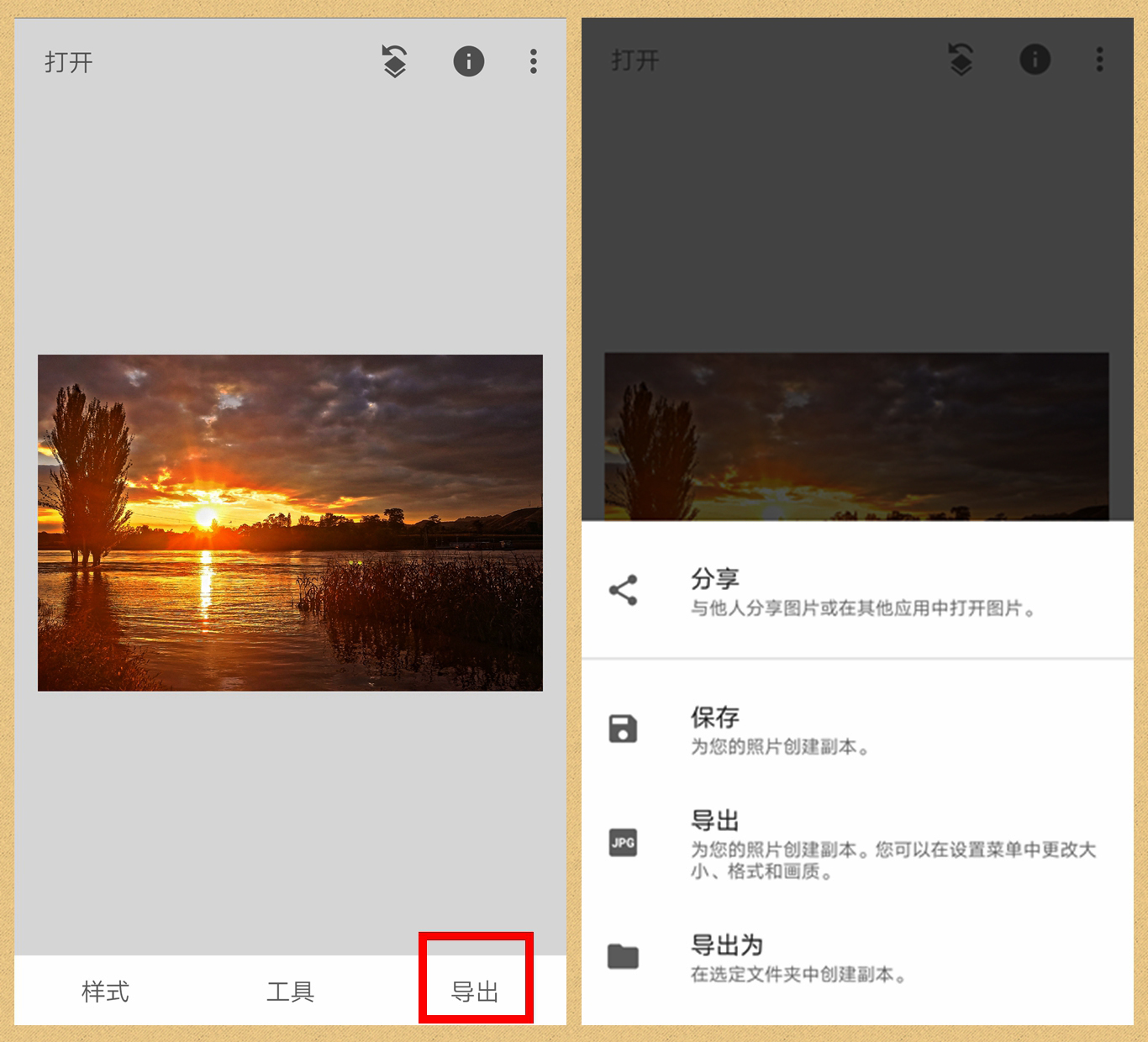 最后,点右下角“导出”,再保存照片,整个后期步骤就完成了。