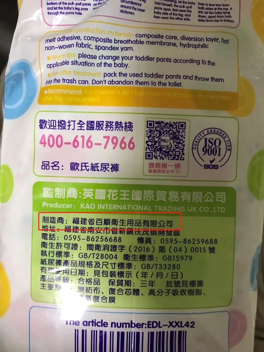 《中国消费者报》记者在黄先生提供的“英国花王”婴儿拉拉裤产品包装上看到,其制造商标称为福建省百顺卫生用品有限公司。