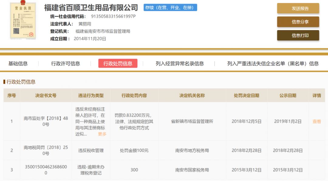 记者登录国家企业信用信息公示系统查询后发现,该企业有3条行政处罚信息。其中有一条行政处罚显示为: 违反未经商标注册人的许可,在同一种商品上使用与其注册商标近似的商标,或者在类似商品上使用与其注册商标相同或者近似的商标,容易导致混淆。