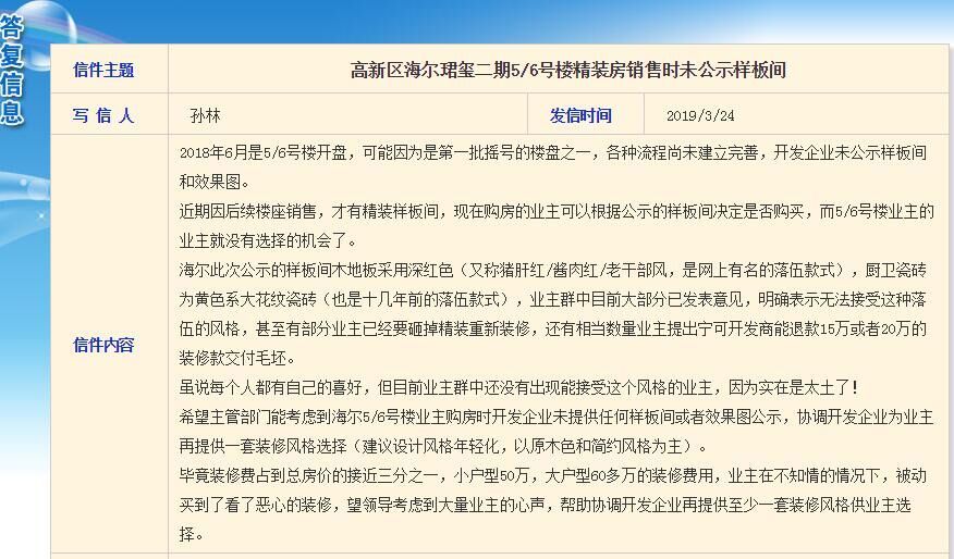 对于业主们反映的问题,高新区管委进行了落实。经落实,海尔珺玺项目面向市场推出时,已经向青岛高新区国土分局申请了精装修房屋交付并申请了价格备案。为保障购房人的知情权和选择权等相关权益,相关部门已要求企业在销售阶段将相关装修信息明确告知购房人,并在售楼现场予以公示。对于装修风格问题,则建议双方协商在合同中明确,按合同约定执行。
