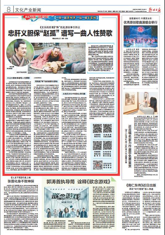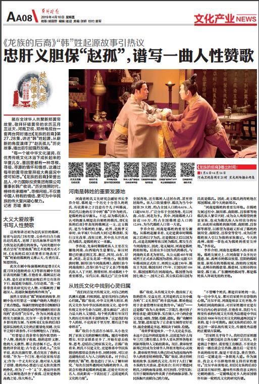 中原网讯(郑报融媒记者 秦华 苏瑜)就在全球华人共聚新郑黄帝故里、敬拜轩辕黄帝的农历“三月三”这天,河南卫视、郑州电视台两台同时播出《龙族的后裔》第27、28集,讲述“韩”姓起源,从崭新的角度演绎了“赵氏孤儿”历史故事,播出后引起强烈反响。