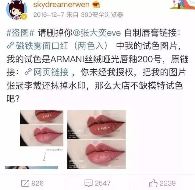 2016年,张大奕号称自制口红上市。广告却是盗取他人试色Armani的贴图。