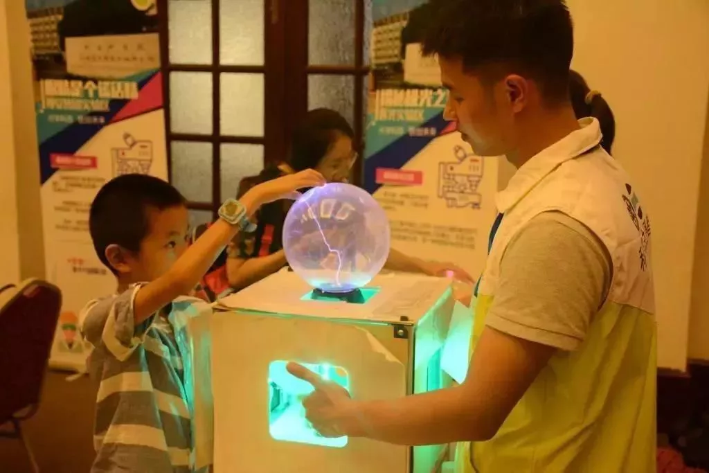 辉光实验区里,神奇的辉光球和光学防盗网两个小实验可以让让朋友们体验绚丽多彩的“极光”现象。