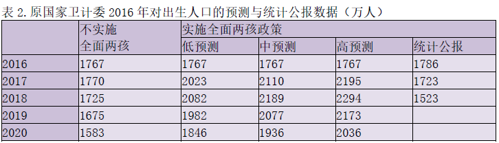 如果说2011-2015年的生育率依然迷雾重重,对全面二孩政策效果预测一错再错则是昭然若揭。表2的预测来自原国家卫计委副主任王培安主编的《实施全面两孩政策人口变动测算研究》,该报告排名首位的专家正是翟振武。尽管之前单独二孩政策实施效果预示了中国生育意愿的低迷,但这个在全面二孩实施之初公布的预测依然是谬之千里。