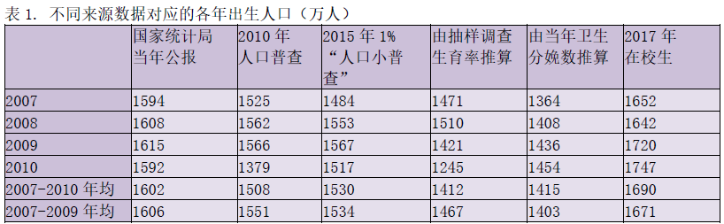 表1显示了不同来源报告或推算的2007至2010年出生人口。其中,2010年人口普查和2015年1%"人口小普查"使用对应岁数的人口,后者按全国总人口成比例调整;由分娩数推算的是当年卫生机构活产数/住院分娩率;2017年在校生分别是各年级学生数,假设所有孩子6岁上学,且没有变更年级。据生命表推算,2006年以来,0至12岁的累计死亡率不到2.5%,所以忽略夭折对分析影响有限。