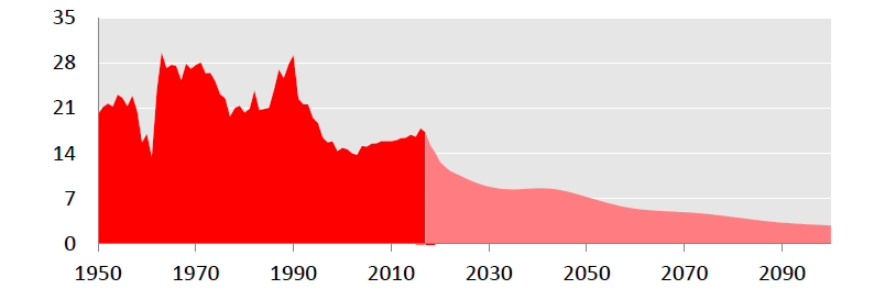翟振武进一步声称,“在总和生育率为1.6的情况下,中国人口总量在2028年将达到峰值,然后开始下降。到本世纪末,中国人口数量接近10亿。” 严格来说,这并非人口预测,而是基于一个目前看来高不可及的假设,绘制完全虚幻的远景。如果生育率5年内逐步跌至1.2,那中国人口将早至2021年达到高峰,到本世纪末总人口将跌至6.5亿,到2150年将跌到3.3亿。