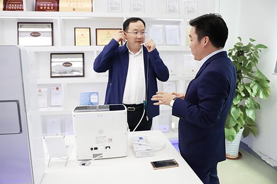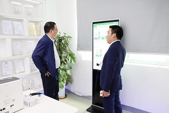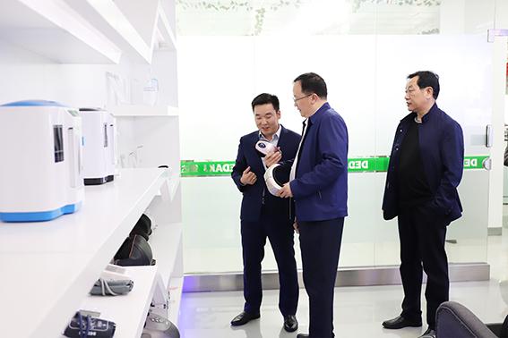 考察团一行首先参观了德达康健产品展示厅,毛德涛向唐克俭一行详细的介绍了企业自主研发的健康产品。唐克俭一行现场体验了德达康健自主研发的制氧机及眼部按摩器,并对相关产品给予高度评价和认可。