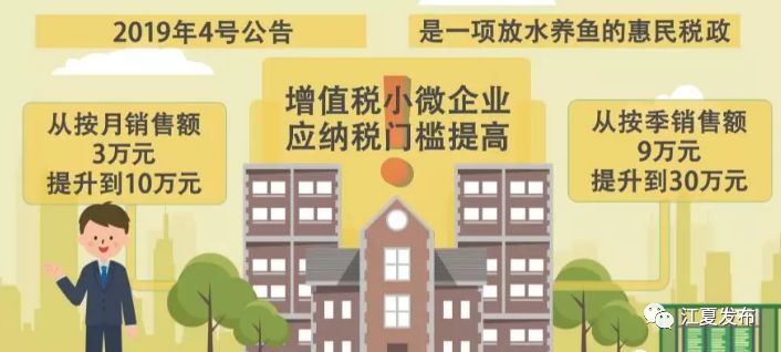 相关负责人介绍说,2019年4号公告,是一项放水养鱼的惠民税政,最突出的特点是把增值税小微企业应纳税门槛提高,从按月销售额3万元提升到10万元,从按季销售额9万元提升至30万元.
