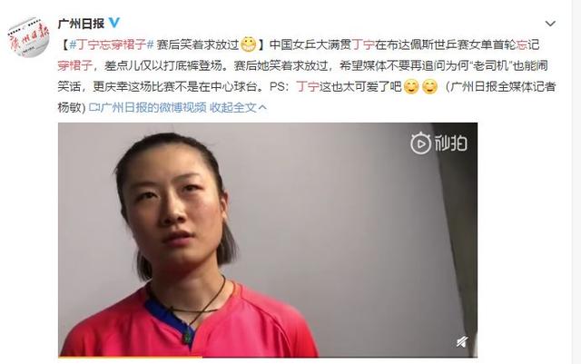 【#丁宁忘穿裙子# 赛后笑着求放过[坏笑]】中国女乒大满贯丁宁在布达佩斯世乒赛女单首轮忘记穿裙子,差点儿仅以打底裤登场。赛后她笑着求放过,希望媒体不要再追问为何“老司机”也能闹笑话,更庆幸这场比赛不是在中心球台。PS:丁宁这也太可爱了吧[可爱][可爱](广州日报全媒体记者 杨敏)