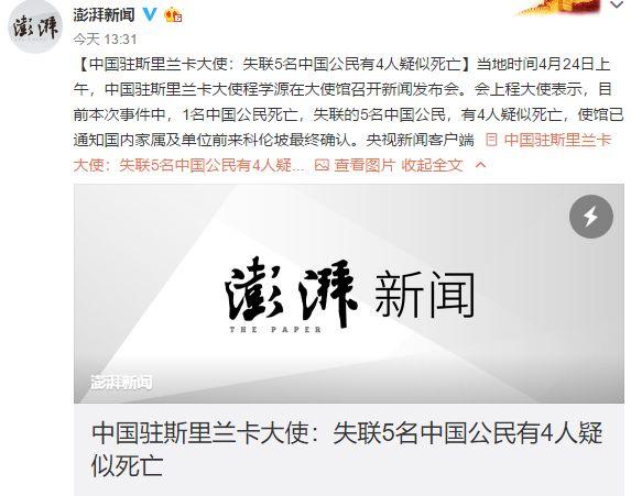 【中国驻斯里兰卡大使:失联5名中国公民有4人疑似死亡】当地时间4月24日上午,中国驻斯里兰卡大使程学源在大使馆召开新闻发布会。会上程大使表示,目前本次事件中,1名中国公民死亡,失联的5名中国公民,有4人疑似死亡,使馆已通知国内家属及单位前来科伦坡最终确认。央视新闻客户端