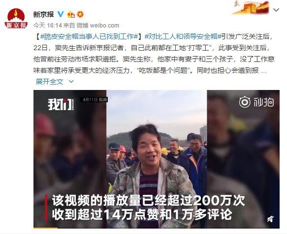 【#脆皮安全帽当事人已找到工作#】#对比工人和领导安全帽#引发广泛关注后,22日,窦先生告诉新京报记者,自己此前都在工地“打零工”,此事受到关注后,他曾前往劳动市场求职遭拒。窦先生称,他家中有妻子和三个孩子,没了工作意味着家里将承受更大的经济压力,“吃饭都是个问题”。同时也担心会遭到报复,精神压力很大。今日(24日),窦先生告诉新京报记者,目前他已通过朋友找到工作,过两日将去青岛工地。