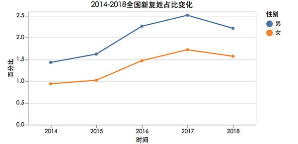 报告显示,2014年到2017年,新生儿尝试“新复姓”的比例快速增长,四年即实现了翻倍,男宝宝达到了2.51%。女宝宝也上升到了1.73%。