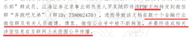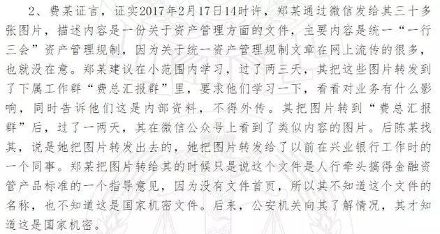 郑某看过之后将文件照片转发给了廊坊银行主管同业业务的总监费某,费某将文件照片发布到了名为“费总工作汇报群”的下属工作微信群,该群成员廊坊银行金融同业管理部总经理陈某将文件照片发给了研究机构员工翟某。