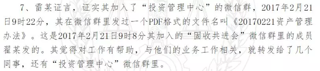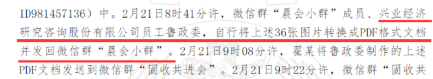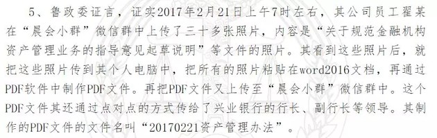 2017年2月21日7时03分许,翟某将文件照片发到了“晨会小群”和“固收共进会”两个微信群。2017年2月21日8时41分许,“晨会小群”微信群成员兴业经济研究咨询股份有限公司员工鲁政委,将上述36张图片转换成为PDF格式文档,文件名为《20170221资产管理办法》并发回“晨会小群”。2017年2月21日9时08分许,翟某将该文件回发到“固收共进会”微信群。