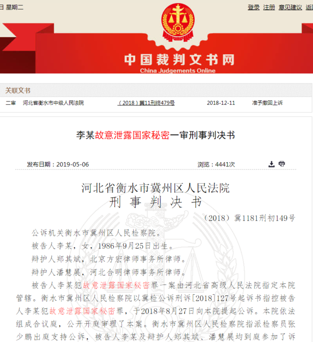 5月6日,中国裁判文书网公布了《李某故意泄露国家秘密一审刑事判决书》。
