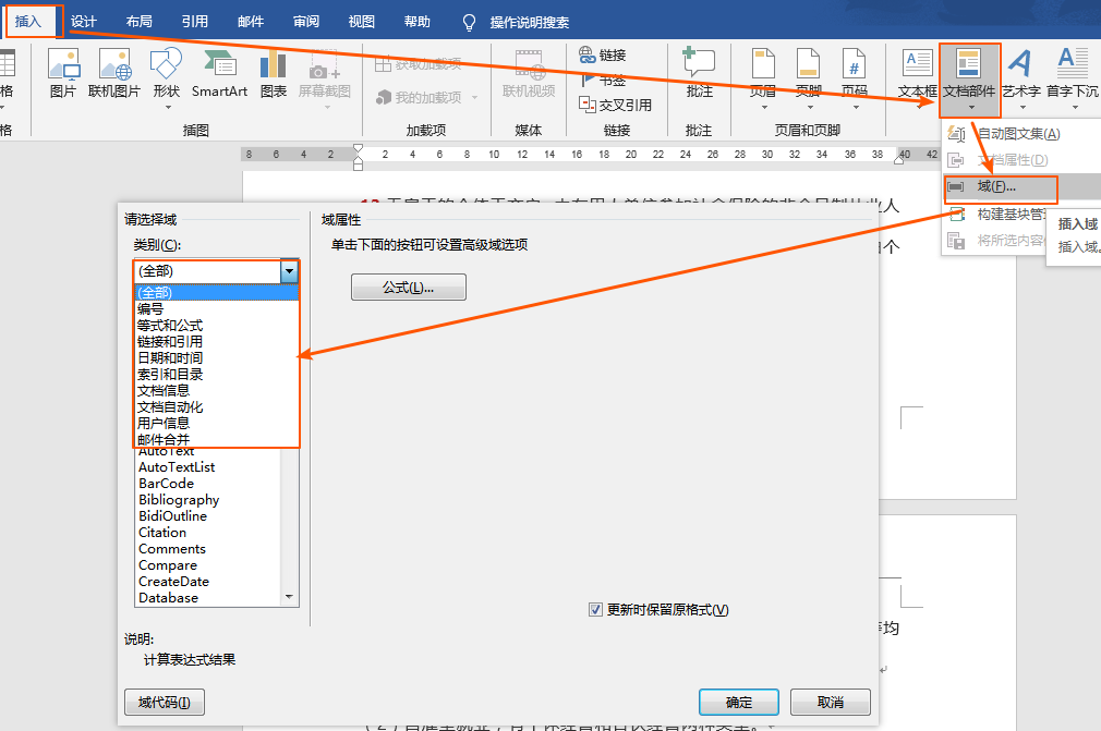 在word中,打开【插入】选项卡——【文档部件】——【域】,在【域】的功能对话框中,可以看到有全部、编号、等式和公式等多种类别,通过选择这些类别,可以使用域来进行自动更新的相关功能。包括公式计算、变化的时间日期、邮件合并等。