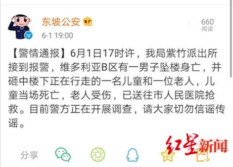 6月1日19时许,红星新闻记者从四川省眉山市东坡区公安分局证实此事,该局通报:6月1日17时许,我局紫竹派岀所接到报警,维多利亚B区有一男子坠楼身亡,并砸中楼下正在行走的一名儿童和一位老人,儿童当场死亡,老人受伤,已送往市人民医院抢救。目前警方正在开展调查,请大家切勿信谣传谣。
