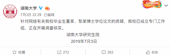 7月3日晚,湖南大学回应道,“针对网络有关我校毕业生董某、黎某博士学位论文的质疑,我校已成立专门工作组,正在开展调查核实”。