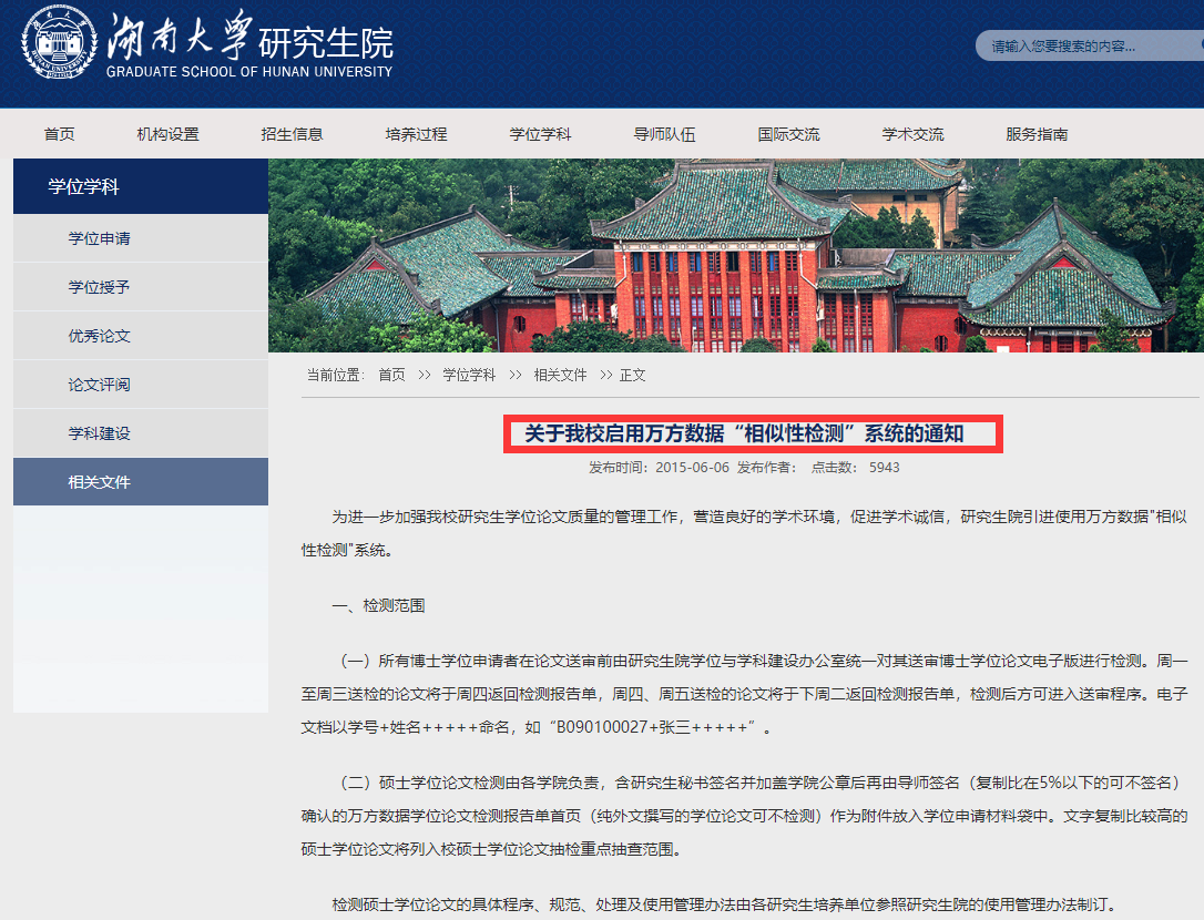 2015年,湖南大学研究生曾发布《关于我校启用万方数据“相似性检测”系统的通知》。通知规定:文字复制比超过35%的博士学位论文,由学位申请人员对论文检测重复部分做出详细说明并由导师签署意见,研究生院将组织专家组对论文检测结果进行评议和分析。如专家组不同意该论文送审,学位申请人员3个月后方可申请进行第二次检测;如专家组同意该论文送审,论文检测报告、说明及专家组意见将作为博士学位申请材料附件提交校学位评定委员会大会讨论。如该论文存在学术不端行为,该学术不端行为将提交校学术道德委员会审议。