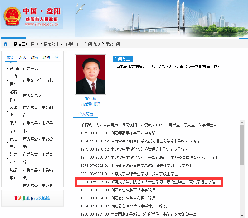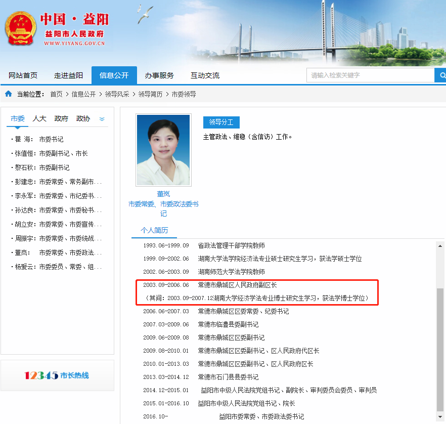 记者了解到,董岚现任湖南省高级人民法院党组成员、政治部主任,益阳市委常委、市委政法委书记,曾于任职常德市鼎城区人民政府副区长期间在湖南大学法学院学习,获得博士研究生学位。黎石秋现任湖南省益阳市委副书记,曾于任职宁乡县委副书记、政府县长期间在湖南大学法学院学习,获得博士研究生学位。