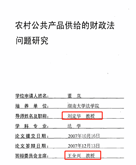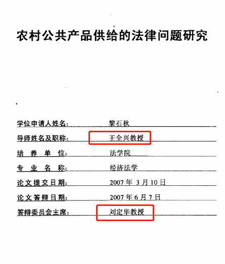 两人研究方向均为农村公共产品供给的法律问题。黎石秋的导师为王全兴,答辩委员会主席为刘定华;董岚的导师为刘定华,答辩委员会主席为王全兴。