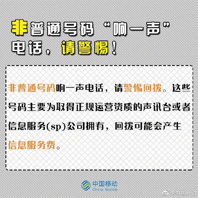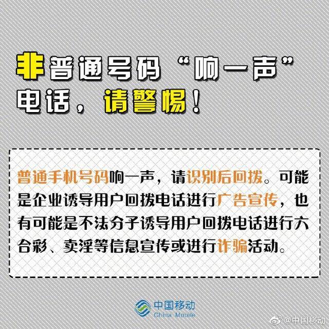 在日常生活中,我们或多或少都接到过“响一声就挂”的电话,很多人会对这类电话感到好奇,然后便回拨过去,殊不知,前面可能正有一个陷阱等待着你。这背后有着什么样的套路?又该如何避免此类问题呢?中国移动官方作了几张图进行解答。