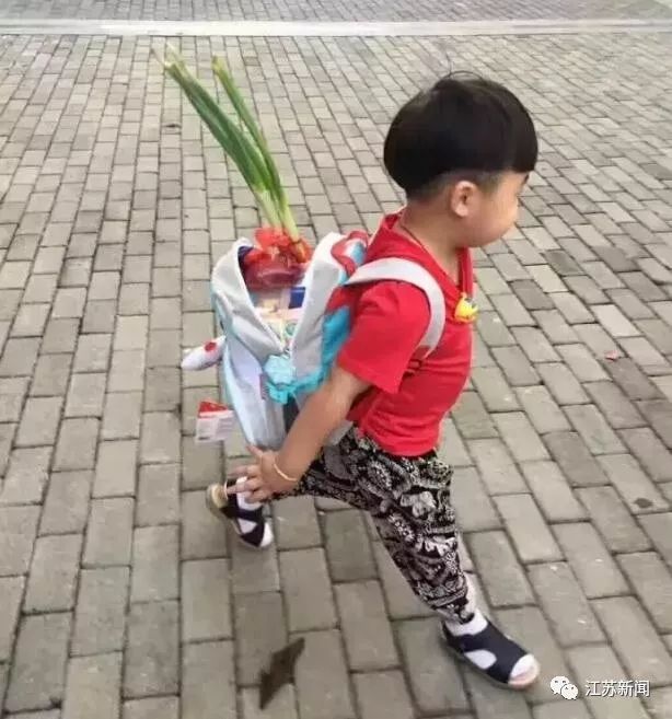 江苏泰州一个小男孩背着葱闪亮登场了!