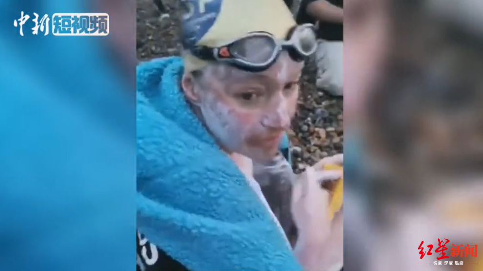 “我被一只水母刺伤了脸,海水没有我想象的那么冷,但依然很凉。”根据海峡游泳和飞行员联合会规则,托马斯在进行挑战时,只被允许戴帽子,护目镜和泳衣。