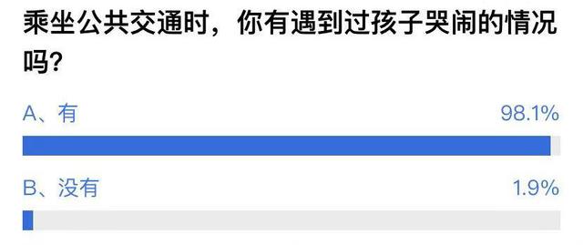 实际上,在乘坐公共交通工具时遇到孩子哭闹的情况十分常见。调查结果显示,有98%的受访网友均表示,在乘坐公共交通工具时遇到过孩子哭闹。面对这样的情况,虽然有少数人会选择帮忙哄孩子或者找孩子的父母解决,但有超过7成的受访网友还是选择理解并忍耐。