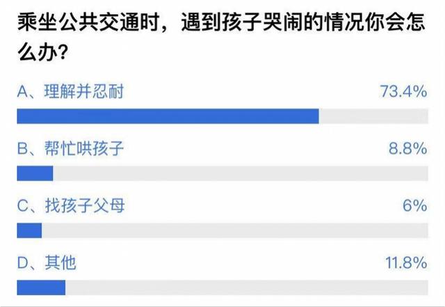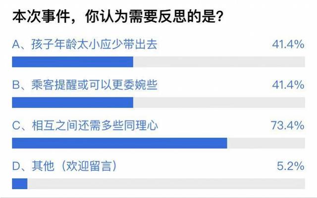 调查结果也显示,透过本次事件,73.4%的网友认为相互之间还需多些同理心。作为父母,孩子年龄太小可以考虑少带出去。作为乘客,即使受到影响无法忍耐,提醒的言语也可以更委婉些。