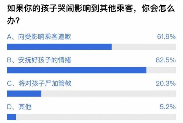 在调查中,超过8成的受访网友都表示,如果自己的孩子哭闹影响到其他乘客,会安抚好孩子的情绪,超6称网友表示会向受影响的乘客道歉。有20.3%的网友表示,还将对孩子严加管教。这其实也说明了,绝大部分的父母不会对孩子的哭闹不管不顾。
