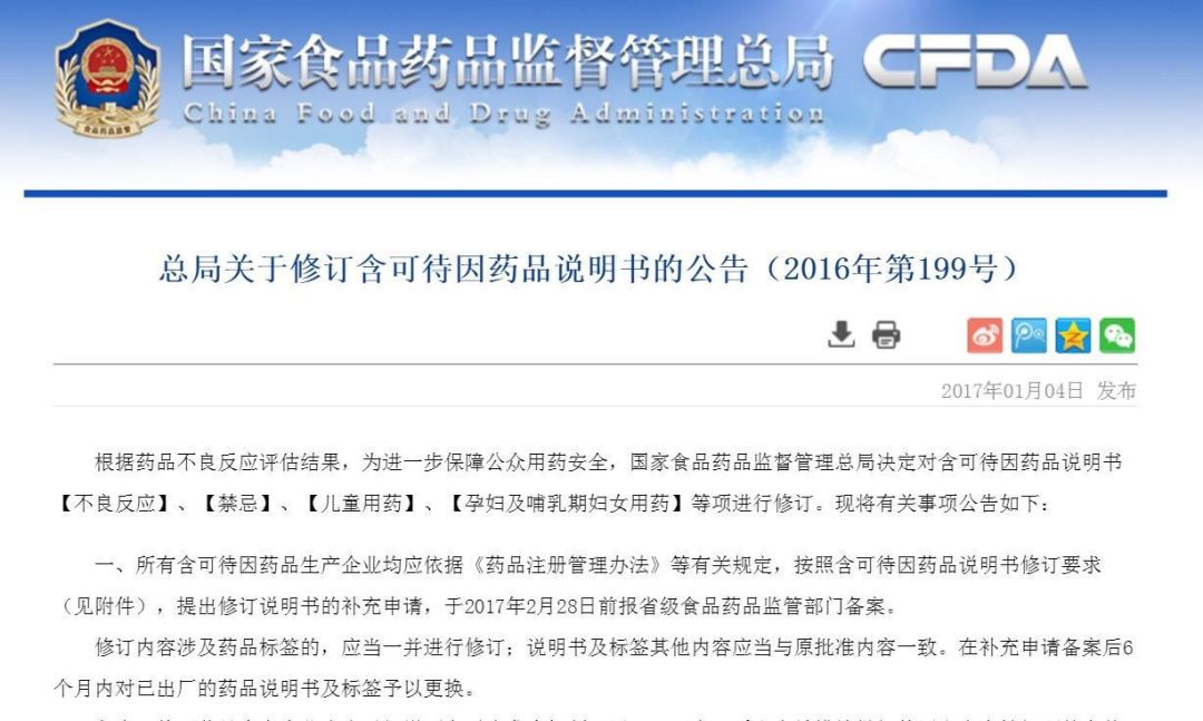 2017年国家食药监总局在官网上公布了《关于修订含可待因药品说明书的公告(2016年第199号)》。