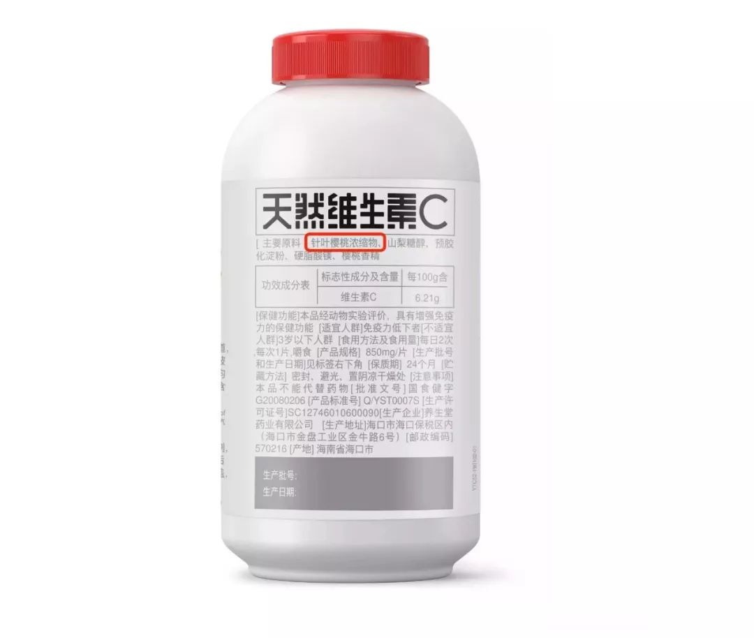 而天然维生素从配料表上看,并没有维生素C的成分。它的VC主要来自天然植物原料中,比如养生堂的天然维生素C就是100%来自针叶樱桃。所以它的成分表写的是:针叶樱桃浓缩物。