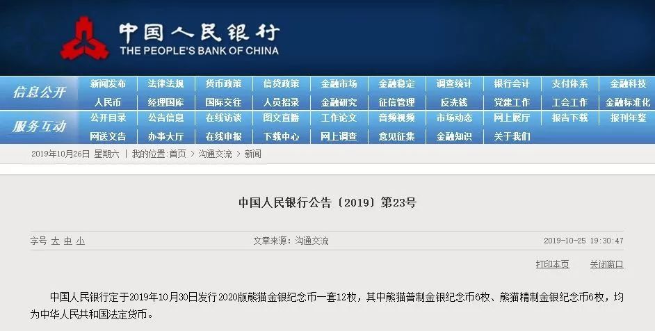 中国人民银行定于2019年10月30日发行2020版熊猫金银纪念币一套12枚,其中熊猫普制金银纪念币6枚、熊猫精制金银纪念币6枚,均为中华人民共和国法定货币。